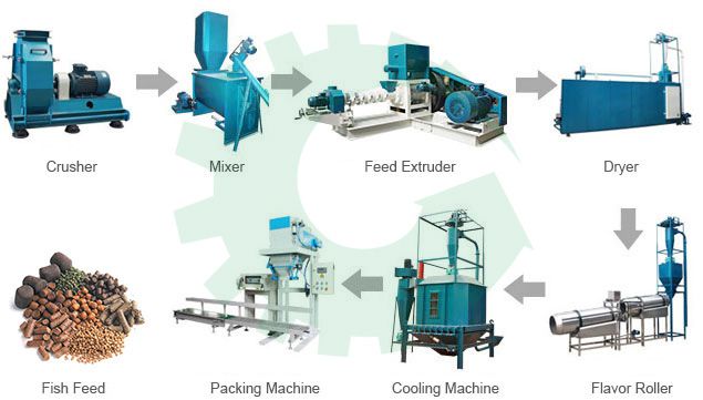 The main floating fish feed production process by this fish feed mill plant are crushing, mixing, extruding, drying and seasoning.