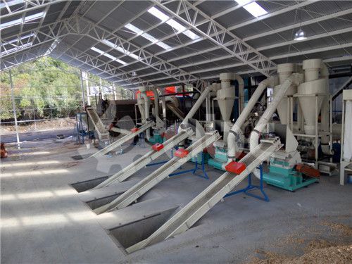 This large scale pellet mill plant utilizes 3 sets of 2t/h crusher to grind wood chips. The raw material after crushed is delivered to elevator by air-lock valve; the elevator transfers it into wet material storage bin. Then the wet material is delivered into dryer. After drying, the dry material is dispatched into the pellet mill. And then, pellets are packed into small and big bags.Advantages of this large pellet mill plant